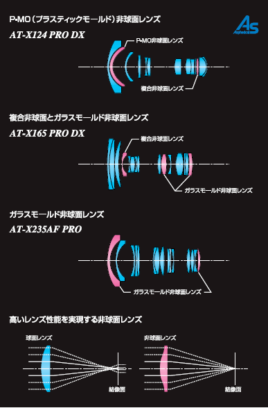 現在、トキナーはガラスモールド非球面レンズ、複合非球面レンズ、P-MO非球面レンズを採用しており、個々のレンズの性質に合った非球面レンズを効果的に配置し、描写性能の向上を図っております。